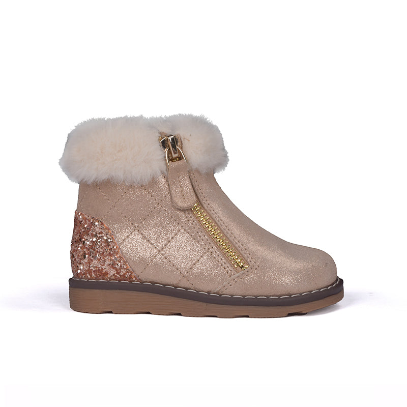 Flora's comfortable and cozy design offers is a durable choice for your child's winter wardrobe. Each pair is crafted with a side zipper, slight wedge, and a touch of glitter for a pop of fun.